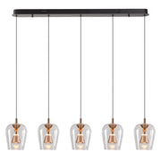 Perfect your home lighting solution with the Wizard 5 Light Clear Glass and Golden LED Pendant Light. Adjustable suspension cable allows the pendant to be installed at your desired height for a customisable display. Hang in your kitchen, office, or dining room for practical yet contemporary lighting. Also available in a 1 and 7 Light option.